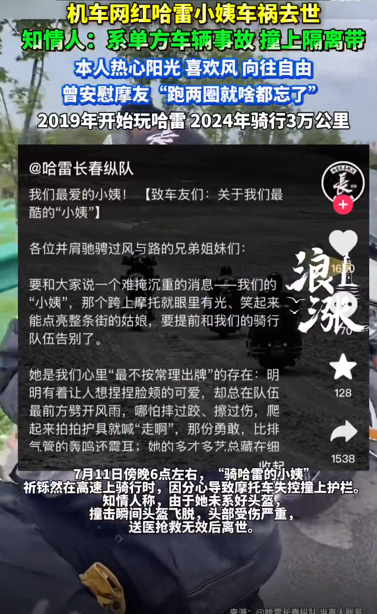 7月19日报道,机车网红哈雷小姨车祸去世,知情人:系单方车辆事故,撞上隔离带。