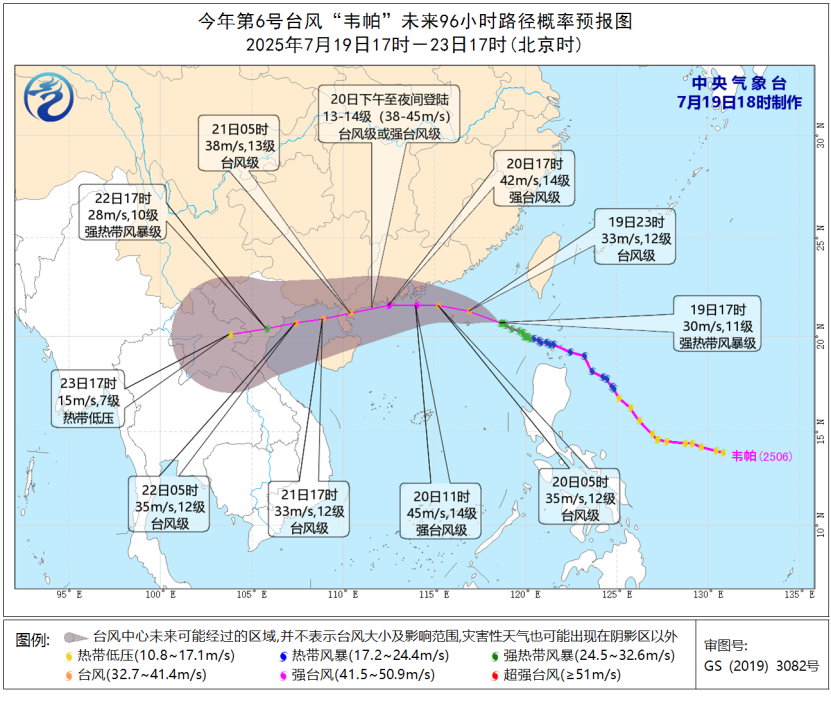 大风预报:7月19日20时至20日20时,受“韦帕”和西南季风的共同影响,南海大部、东沙群岛、西沙群岛、南沙群岛、中沙群岛、雷州半岛沿海、海南岛沿海、福建沿海、巴士海峡、台湾海峡、台湾以东洋面、东海南部将有6~7级风,阵风8~9级,南海北部海域、广东沿海的风力可达8~11级,阵风12~13级,台风中心经过的附近海域风力有12~14级,阵风15~16级。