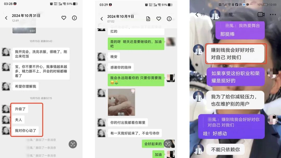 当女性产生同情心后,X风会迅速升级关系。26 岁的小云(化名)称,“没几天时间,他告诉我说喜欢我,在他心中我才是他最重要的家人,其他都是粉丝”,并每天事无巨细地汇报与分享个人生活。