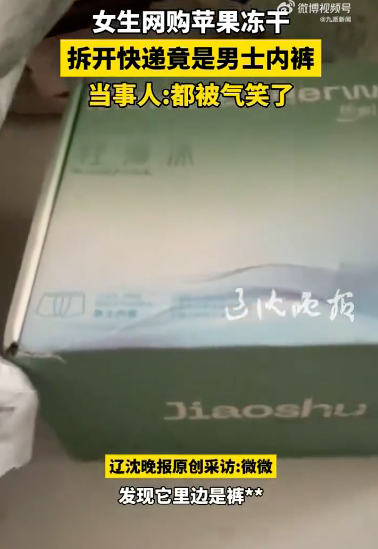 一女生网购苹果冻干,拆开快递竟是男士内裤。当事女生微微告诉记者,当时快递袋上有两个快递面单,当时确实气笑了,目前处理结果是商家全额退款。(辽沈晚报)