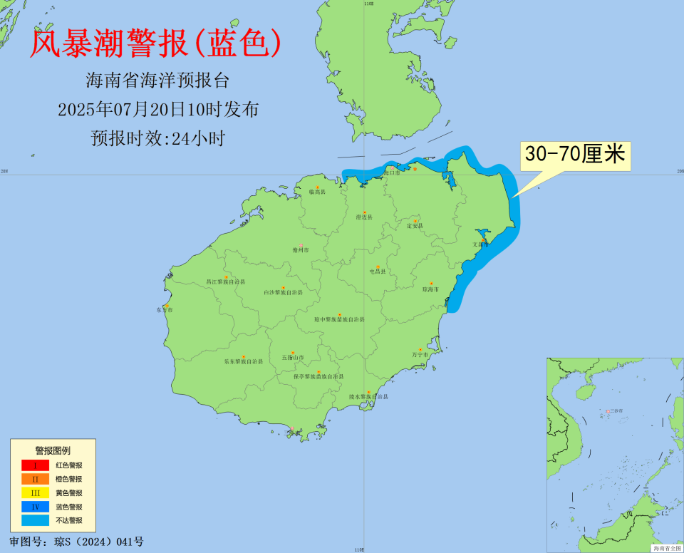 海南省海洋预报台2025年7月20日10时发布风暴潮Ⅳ级警报(蓝色),受台风“韦帕”(台风级)的影响,预计今天(20日)中午到明天(21日)中午,海南岛东北部沿海将出现30到70厘米的风暴增水。上述岸段内的潮位站将不会出现达到当地蓝色警戒潮位的高潮位。风暴潮预警级别为蓝色。请有关单位做好防潮准备,并密切关注海南省海洋预报台的后续预报。