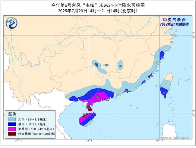 降水预报:7月20日14时至21日14时,广东中南部、香港、澳门、海南岛、广西南部、福建东部、浙江东南部、江西西南部、湖南西南部、台湾岛中南部等地有大到暴雨,其中,广东西南部、香港、澳门、海南岛中北部、广西东南部沿海等地的部分地区有大暴雨,广东西南部、海南岛北部等地局地有特大暴雨(250~350毫米)。上述部分地区伴有短时强降水(最大小时降水量20~50毫米,局地90~110毫米),局地有雷暴大风等强对流天气。