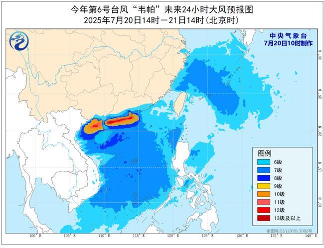 大风预报:7月20日14时至21日14时,受“韦帕”和西南季风的共同影响,南海大部、东沙群岛、西沙群岛、南沙群岛、中沙群岛、海南岛沿海、福建沿海、浙江沿海、巴士海峡、台湾以东洋面、东海大部将有6~7级风,阵风8~9级,南海北部、广东南部及沿海、珠江口、香港、澳门、雷州半岛及其沿海、广西南部及沿海、北部湾的风力可达8~11级,阵风12~13级,台风中心经过的附近海域和地区的风力有12~14级,阵风15~16级。