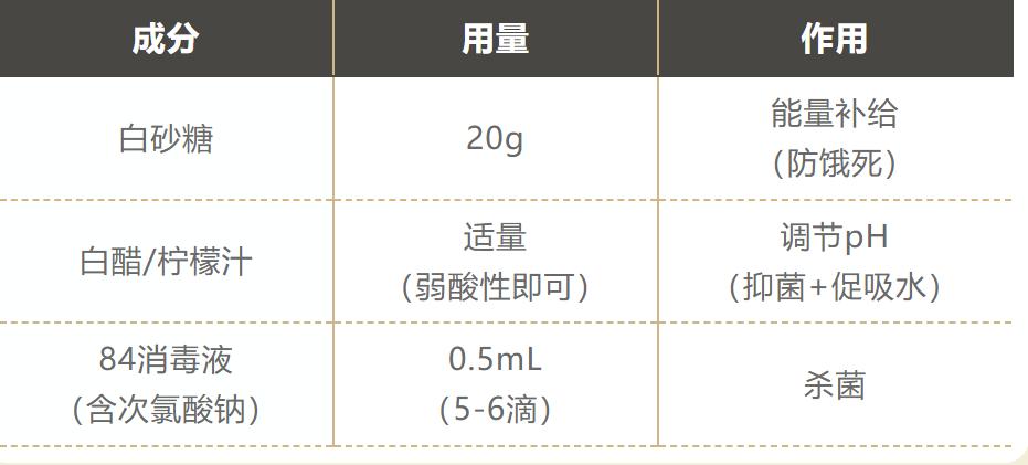 根据切花保鲜的三大核心需求——水分维持、营养供给、抑菌防腐,推荐以下通用配方: