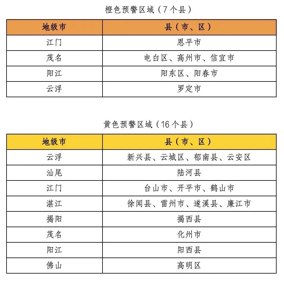 云浮新兴县、云城区、郁南县、云安区,汕尾陆河县,江门台山市、开平市、鹤山市,湛江徐闻县、雷州市、遂溪县、廉江市,揭阳揭西县,茂名化州市,阳江阳西县,佛山高明区,局地发生山洪灾害可能性较大(黄色预警)。