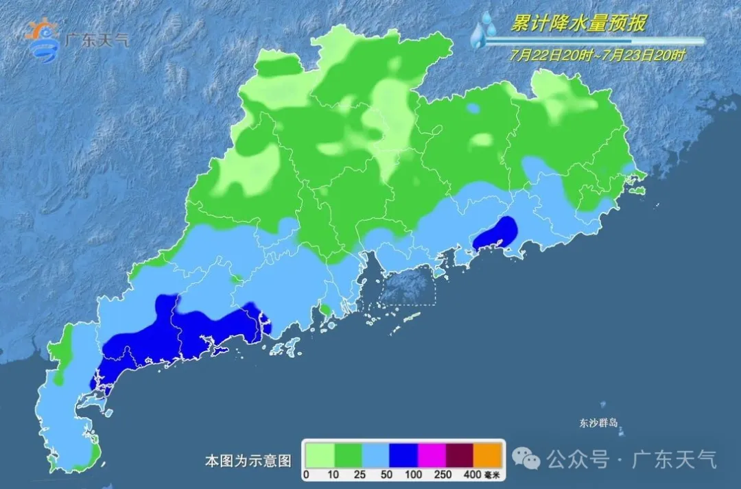 22日,珠三角南部和粤西市县有大雨局部暴雨,粤东市县有中到大雨局部暴雨,其余市县有中(雷)阵雨。最高气温:全省大部分市县介于29~32℃。