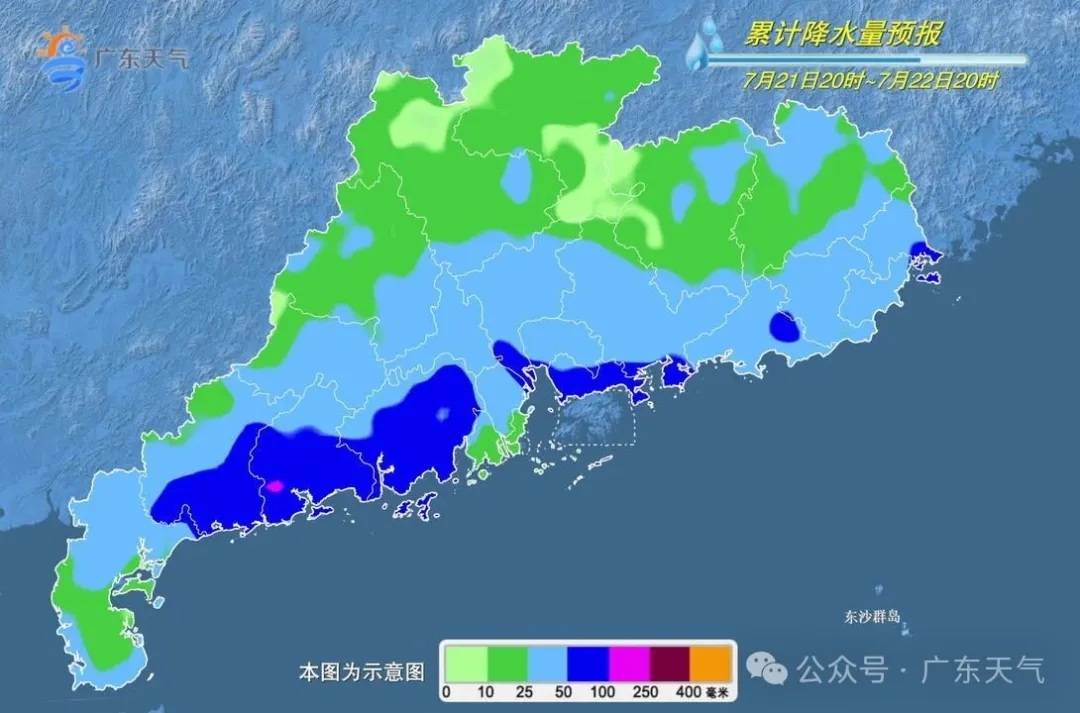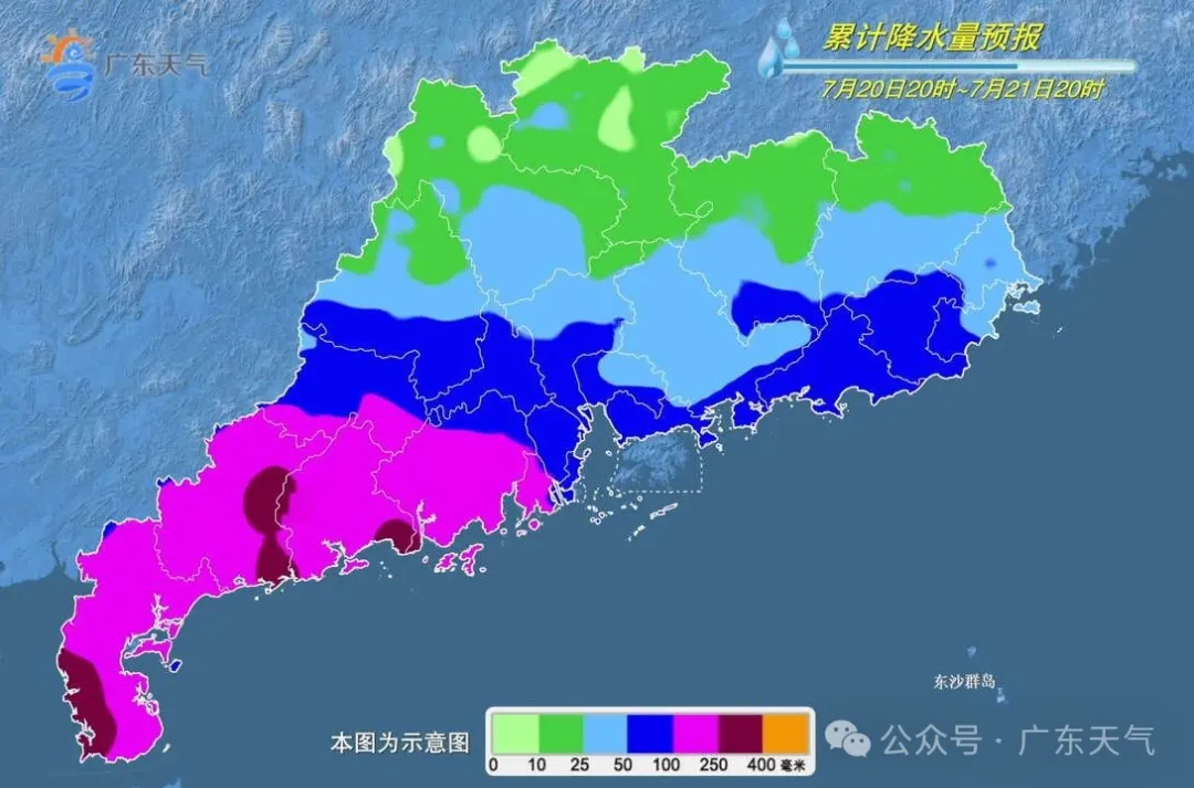 中央气象台预计,7月20日14时至21日14时,广东中南部、香港、澳门、海南岛、广西南部、福建东部、浙江东南部、江西西南部、湖南西南部、台湾岛中南部等地有大到暴雨,其中,广东西南部、香港、澳门、海南岛中北部、广西东南部沿海等地的部分地区有大暴雨,广东西南部、海南岛北部等地局地有特大暴雨;南海北部、广东南部及沿海、珠江口、香港、澳门、雷州半岛及其沿海、广西南部及沿海、北部湾的风力可达8~11级,阵风12~13级,台风中心经过的附近海域和地区的风力有12~14级,阵风15~16级。