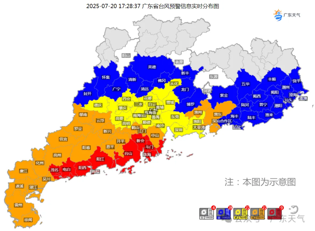 截至7月20日17时28分,广东省有9个台风红色预警、22个台风橙色预警、22个台风黄色预警、28个台风蓝色预警和4个台风白色预警信号生效。
