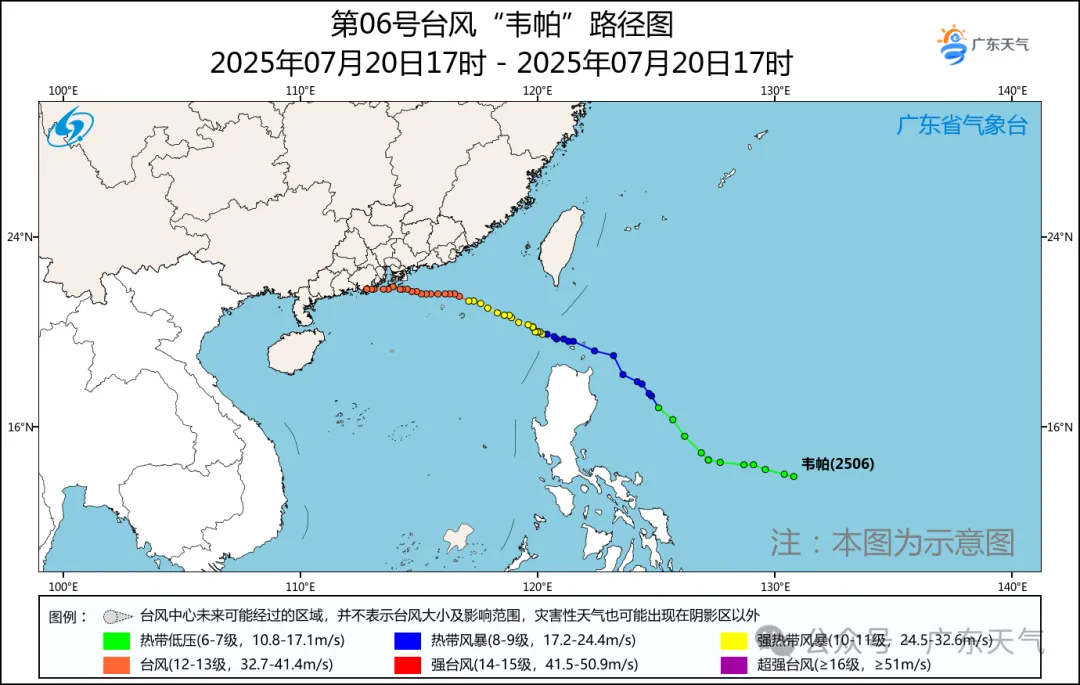 今年第6号台风“韦帕”已于7月20日17时50分前后以台风级在广东江门台山海宴镇沿海登陆,登陆时中心附近最大风力12级(33米/秒),中心最低气压975百帕。