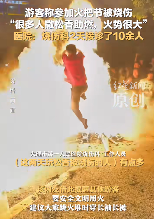 日前,有网友在社交媒体上称参加云南大理火把节时,在跳火堆过程中,撒松香的人特别多,火势很大,导致自己被烧伤。