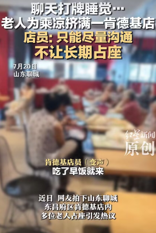 近日,网友拍下山东聊城东昌府区肯德基店内多位老人占座引发热议。视频中老人聚在一起聊天,有的打牌,有的躺座椅上睡觉,但是都没有点餐,评论区不少网友表示这种行为很影响做生意。