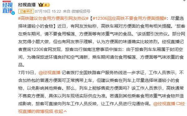 7月19日晚,相关话题#12306回应高铁不要食用方便面提醒#冲上热搜第一,引起网友热议。
