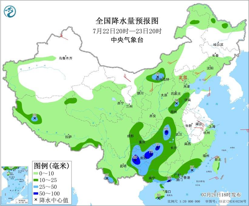图4 全国降水量预报图(7月22日20时-23日20时)