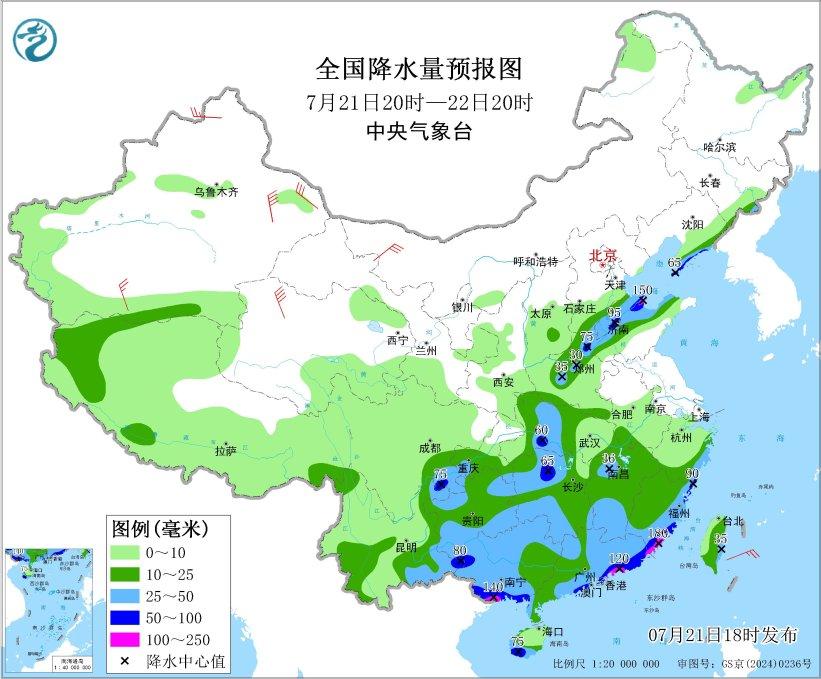 预计,7月21日20时至22日20时,福建东部和南部、广东中东部和南部、香港、澳门、海南岛西部和南部、广西大部、云南东南部以及台湾岛东部、贵州大部、四川盆地南部、重庆南部、湖北西部、湖南中西部、江西西部和南部、浙江东南部、河南中部、山东北部、辽宁东南部等地的部分地区有大到暴雨,其中广东南部沿海、广西南部、福建东部沿海、山东东北部等地的局部地区有大暴雨(100~180毫米)。上述部分地区伴有短时强降水(最大小时降雨量30~50毫米,局地可超过80毫米),局地有雷暴大风等强对流天气(见图2)。中央气象台7月21日18时发布暴雨黄色预警。