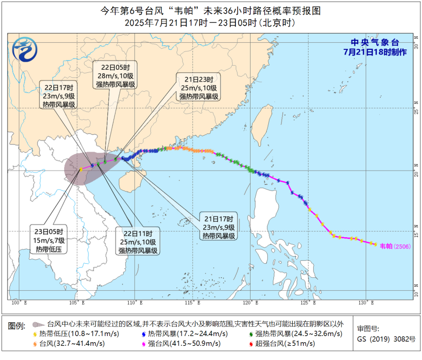 7月21日20时至22日20时,受“韦帕”和西南季风的共同影响,东海南部及钓鱼岛附近海域、巴士海峡、台湾海峡、南海大部、北部湾、琼州海峡、西沙群岛、中沙群岛、南沙群岛以及海南岛沿海、广东中西部沿海、广西沿海等地将有6~7级风,阵风8~9级,其中北部湾、琼州海峡、广西沿海、海南岛西部沿海的风力可达8~9级,阵风10~11级,北部湾部分海域风力有10~11级,阵风12~13级。中央气象台7月21日18时继续发布台风黄色预警。