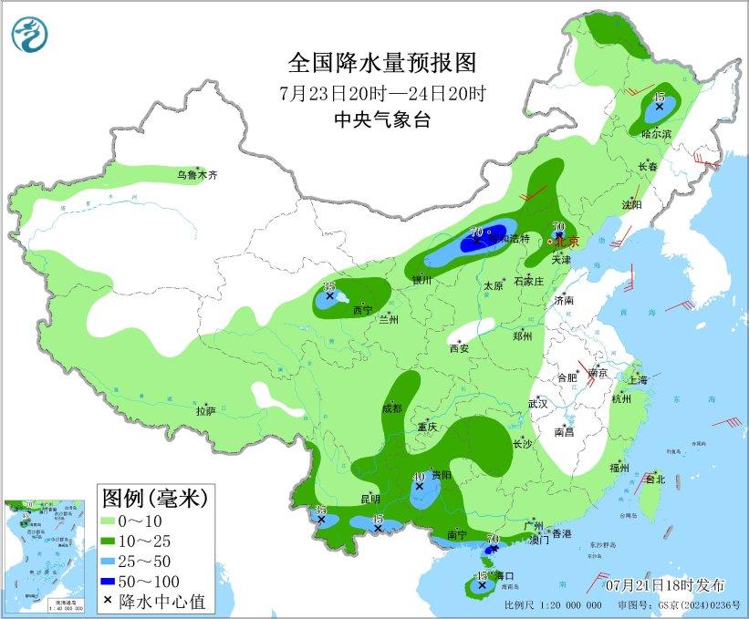图5 全国降水量预报图(7月23日20时-24日20时)