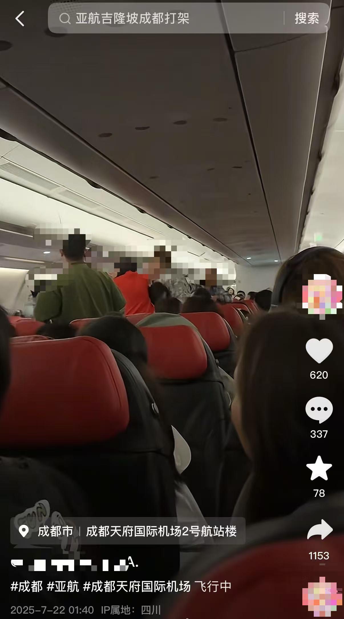 另据百姓关注报道,7月21日,亚航D7326航班发生旅客冲突事件,双方发生了肢体冲突。视频显示,冲突双方是前后排的旅客,期间冲突双方的叫骂声不绝于耳,两边在飞机上不顾其他乘客劝阻互相抓扯。22日,四川省公安厅机场公安局工作人员,回应称已经获知了航班上发生的情况,会依法处理。D7326是马来西亚吉隆坡飞往成都天府国际机场的航班。