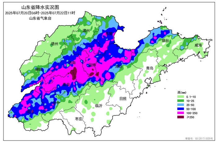 22日11时左右,降水回波主要位于泰安。据山东省气象台消息,7月22日6时至22日11时的5小时里,全省共有12市、68县(区市)、1030乡镇出现降水,平均降水量3.7(毫米,下同),折合水量约5.8亿立方米。