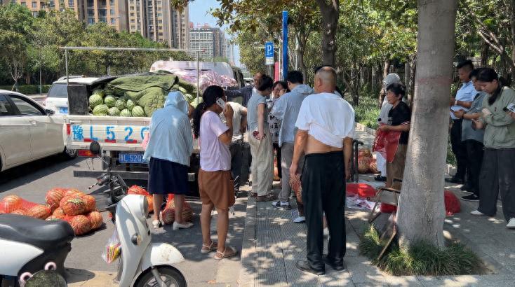 中午一点的漯河,气温直逼40℃。酷暑难当,赶不走孙晓芳瓜摊前的顾客。社区、妇联、物业公司……越来越多的爱心人士汇聚在瓜摊前。