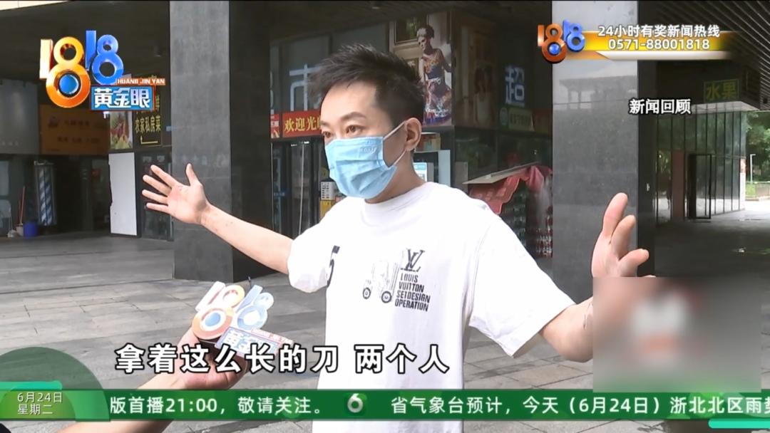 杭州中大银泰城物业 方经理:当时派出所跟我们那个队长、夜班的班长一起到派出所来对了。跟他讲,业主当时是在我们银泰城的南面,就在靠马路边上的那边,当时就是没有拿器械的。