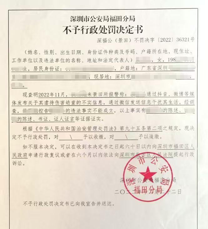2022年12月22日,福田区公安分局出具不予行政处罚决定书称,针对侯女士当初的报警内容,经调查发现她控告赖女士的违法事实不能成立,现决定不予行政处罚。