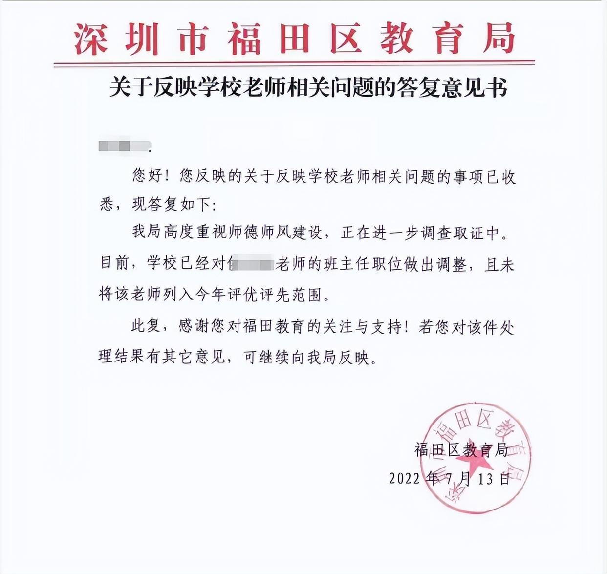 同年7月13日,福田区教育局在给赖女士的答复意见书中称,该局高度重视师德师风建设,学校已对侯女士的班主任职位做出调整,且未将她列入当年的评优评先范围。