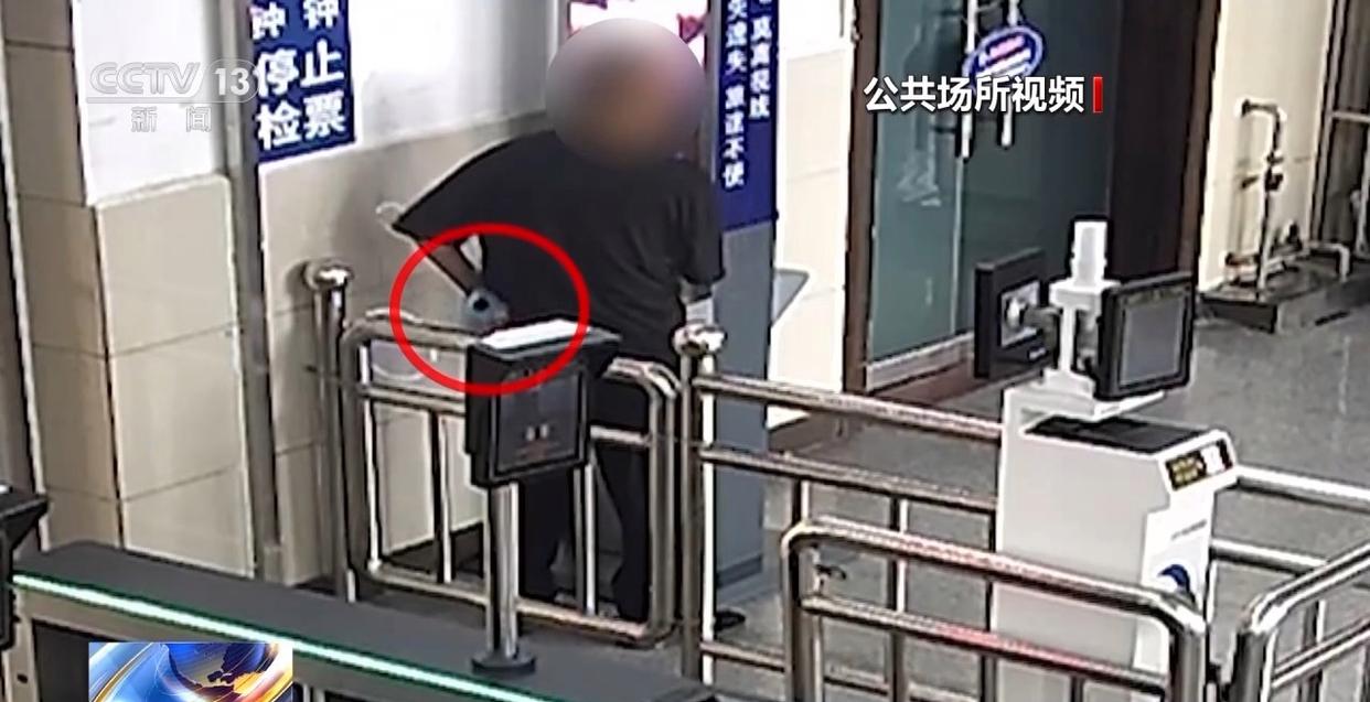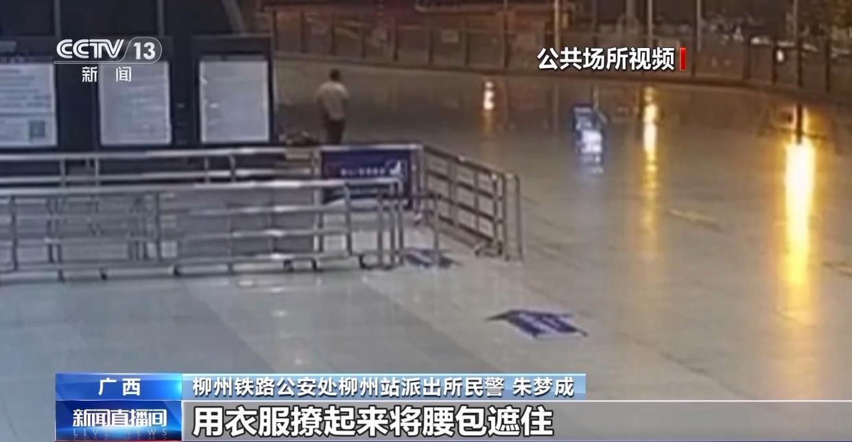 柳州铁路公安处柳州站派出所民警朱梦成:根据周先生的描述,我们发现周先生在熟睡时,有一名身穿白衣的男子来到他身边,用工具将腰包背带割断,将腰包迅速放在自己后腰带内,用衣服撩起来将腰包遮住,迅速逃离现场。