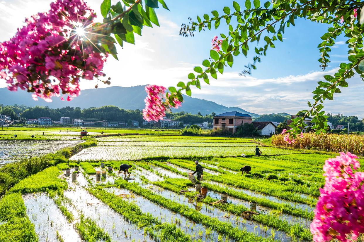 7月21日,农民在湖南省娄底市双峰县荷叶镇长塘村的田间插秧。大暑到来之际,各地农民抢抓农时开展农业生产,田间地头一派繁忙的劳动景象。新华社发(李建新摄)