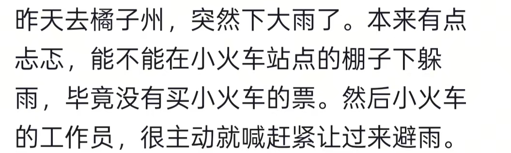 7月21日晚,长沙一度突降大雨,一位游客于当晚发视频称,自己当时在长沙橘子洲游玩,看到景区内小火车在大雨时打开车门,让步行游客上车避雨,该网友在视频中表示:好暖心!