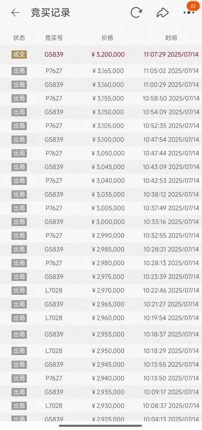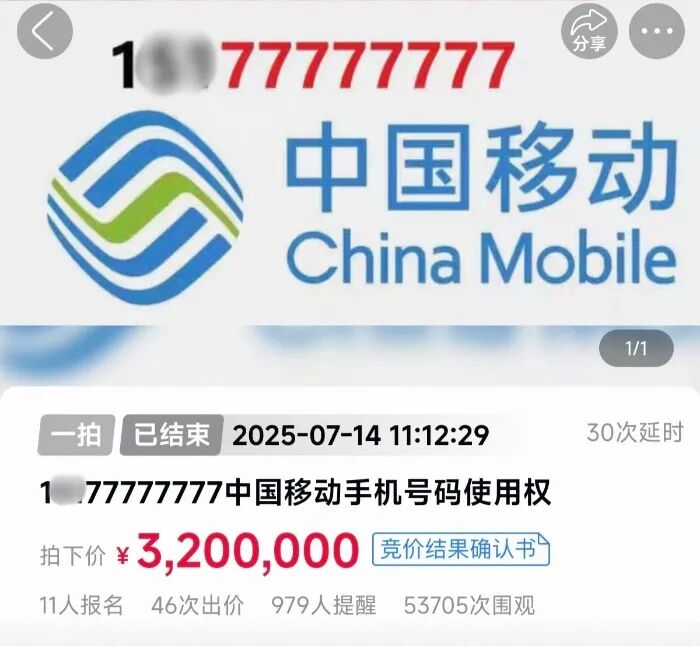 日前,阿里资产拍卖平台显示,手机靓号1**77777777使用权,经过角逐,成功拍出320万元高价。7月22日下午,大皖新闻记者从知情人士处获悉,竞拍人已经在规定期限内缴纳尾款,也就是标的已成交。