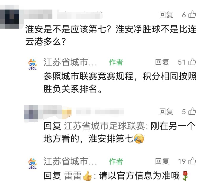 部分网友表示,“苏超”积分榜是不是弄错了?一位网友认为,“淮安是不是应该第七?淮安净胜球不是比连云港多吗?”还有网友表示,在别的地方看到的排名是“淮安排第七”。