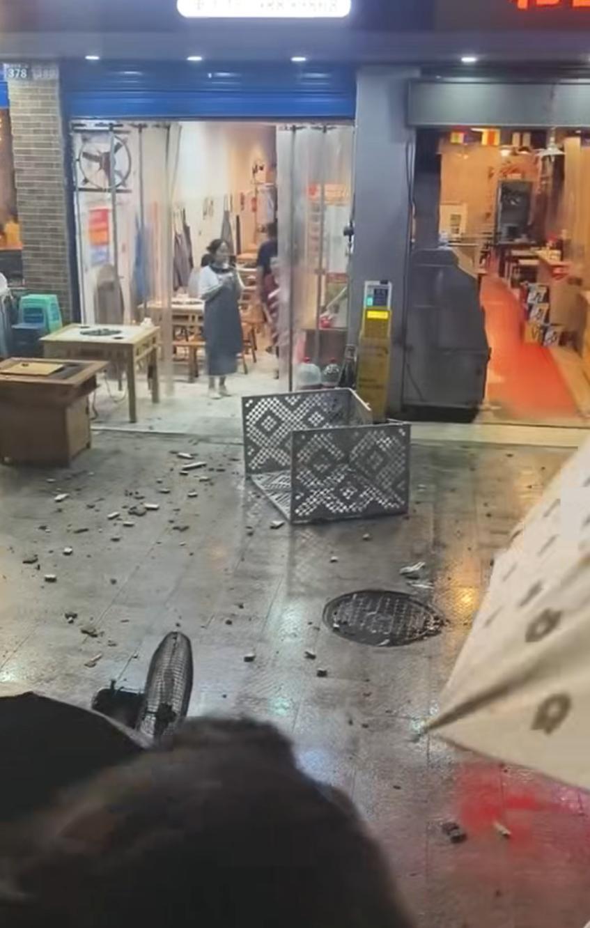 一段42秒视频显示,一条大街上有多家餐馆,餐馆门口站着一些人,门前散落着水泥碎片等硬物,还有一个长条状的中间镂空的盒状物,一名女子坐在椅子上用右手捂着额头,旁边站着穿白大褂的医务人员,两名男子连同她坐的椅子一起抬到停靠在不远处的救护车上。视频中传来另一女子的画外音称,“哎呀,高空坠物,吃个饭出来也是运气霉哦。”