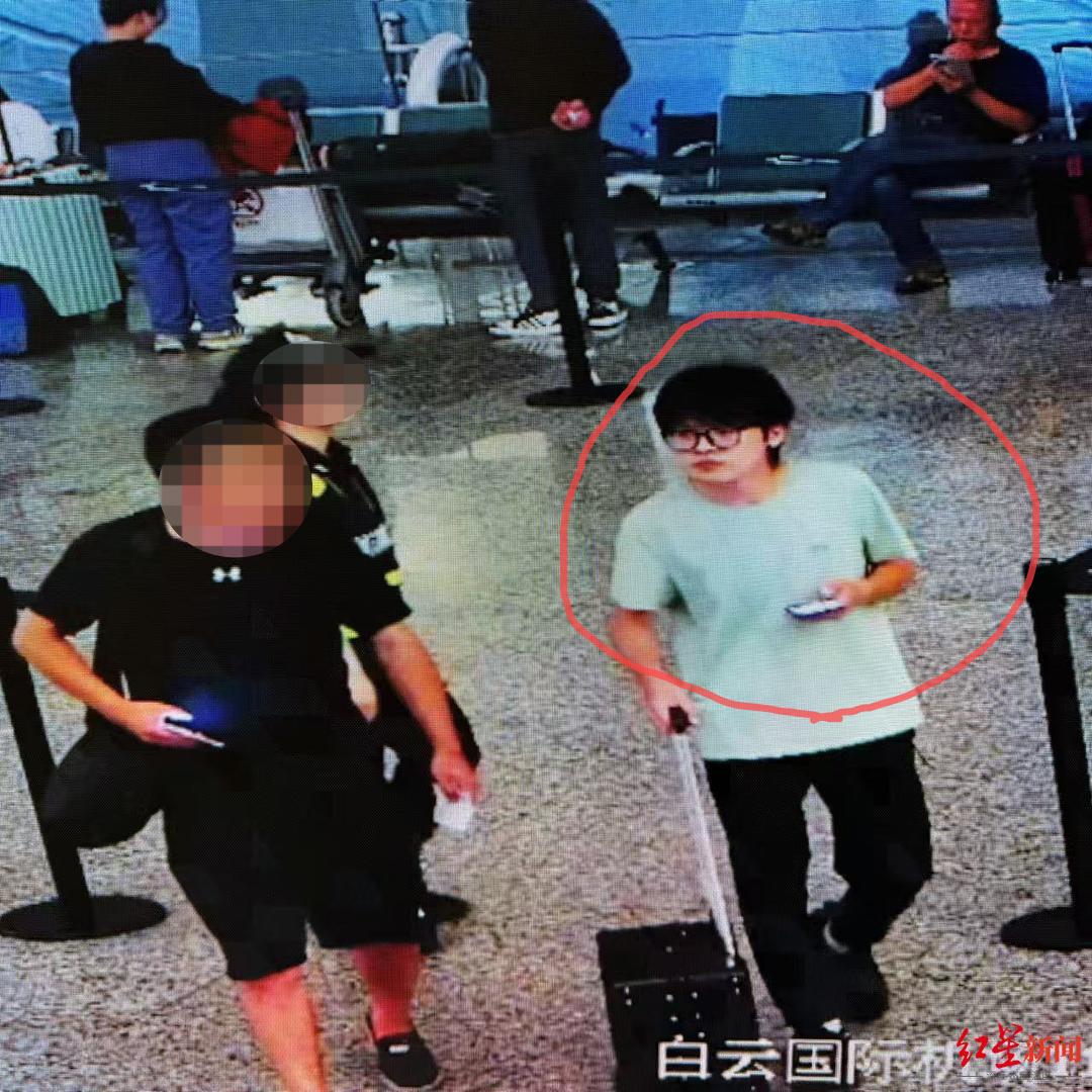 红星新闻获取的监控录像截屏显示,何某杰到达广州白云机场时身穿绿色t恤、黑色长裤,推着一个黑色行李箱。