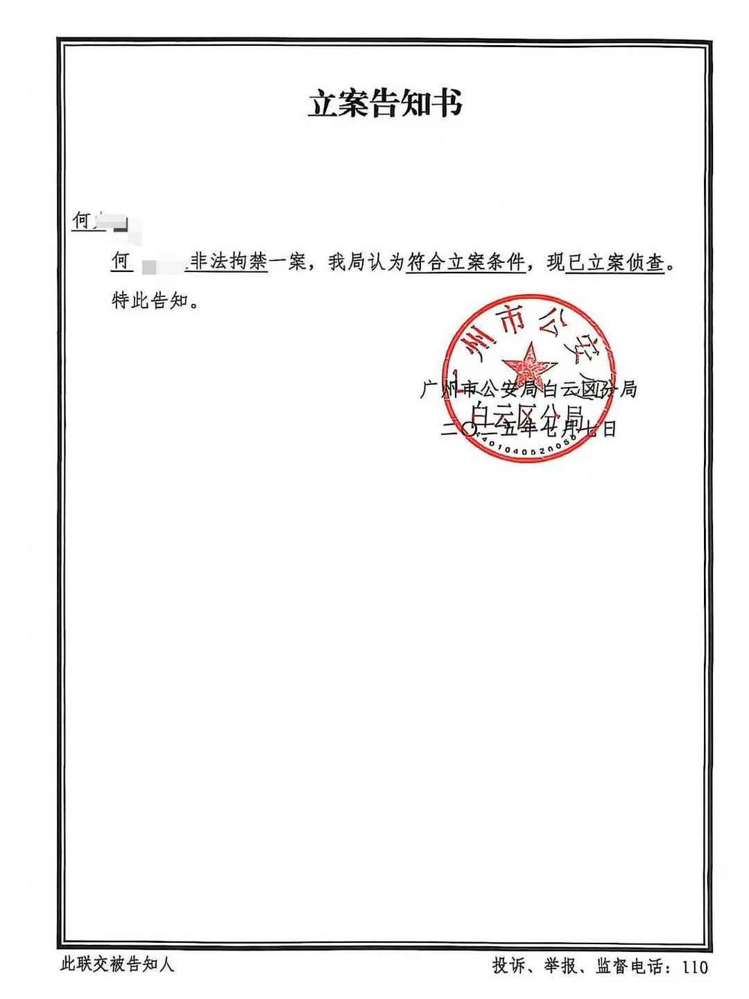 广州市公安局白云区分局7月7日开具的《立案告知书》显示,何某杰被非法拘禁一案,该局认为符合立案条件,已立案侦查。