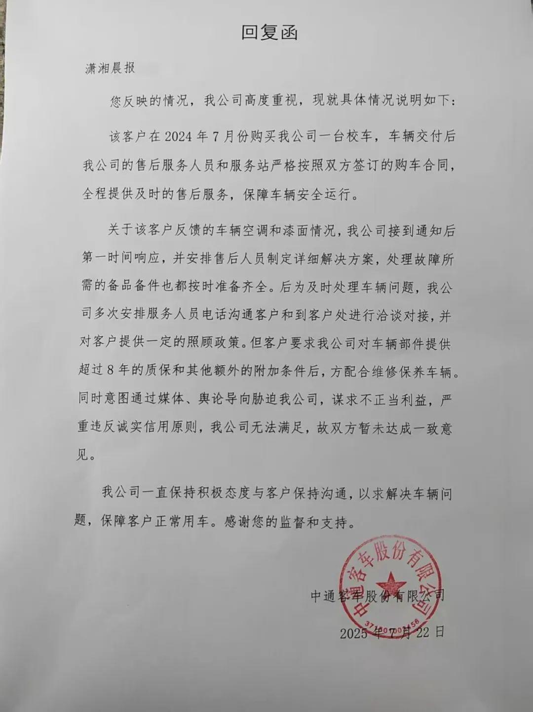 △中通客车股份有限公司回应潇湘晨报记者的回复函。