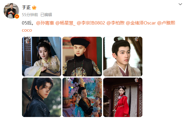 7月21日,于正在社交平台晒出其新剧中6位05后新人演员,分别是 @孙寈惠 @杨星慧_ @李宗浩 0802 @李柏煦 @金绪泽 Oscar @卢雅熙coco ,开启新的造星计划。
