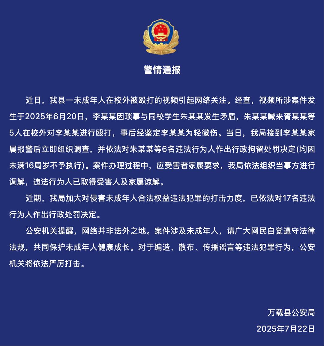 近日,我县一未成年人在校外被殴打的视频引起网络关注。经查,视频所涉案件发生于2025年6月20日,李某某因琐事与同校学生朱某某发生矛盾,朱某某喊来胥某某等5人在校外对李某某进行殴打,事后经鉴定李某某为轻微伤。当日,我局接到李某某家属报警后立即组织调查,并依法对朱某某等6名违法行为人作出行政拘留处罚决定(均因未满16周岁不予执行)。案件办理过程中,应受害者家属要求,我局依法组织当事方进行调解,违法行为人已取得受害人及家属谅解。