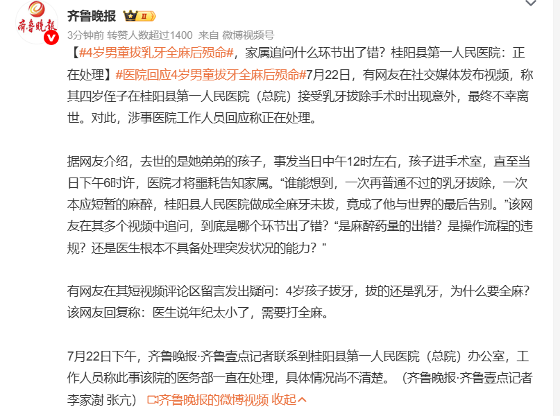 7月22日,有网友在社交媒体发布视频,称其四岁侄子在桂阳县第一人民医院(总院)接受乳牙拔除手术时出现意外,最终不幸离世。对此,涉事医院工作人员回应称正在处理。