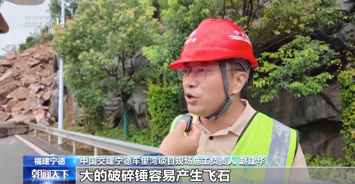 中国交建宁德车里湾项目现场施工负责人 赵建华:因为离沈海高速比较近,大的破碎锤容易产生飞石,对高速车辆行驶造成伤害,所以只能采用人工进行破解。我们还调配了4台装载机、4台挖掘机和18台机械车加5台小型破碎机进行抢险工作,尽快保证交通恢复。