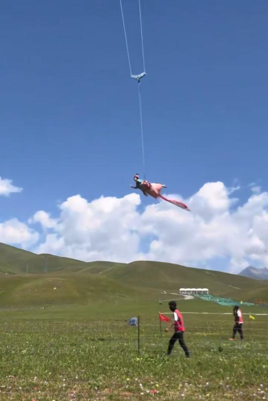 据工作人员介绍,“这个表演项目属于单列的个体,这样的表演必须得有保险。它那个属于滑草项目,挂的是‘威亚’,就是挂着绳索在天上飞的项目,有一个天女散花的环节。”