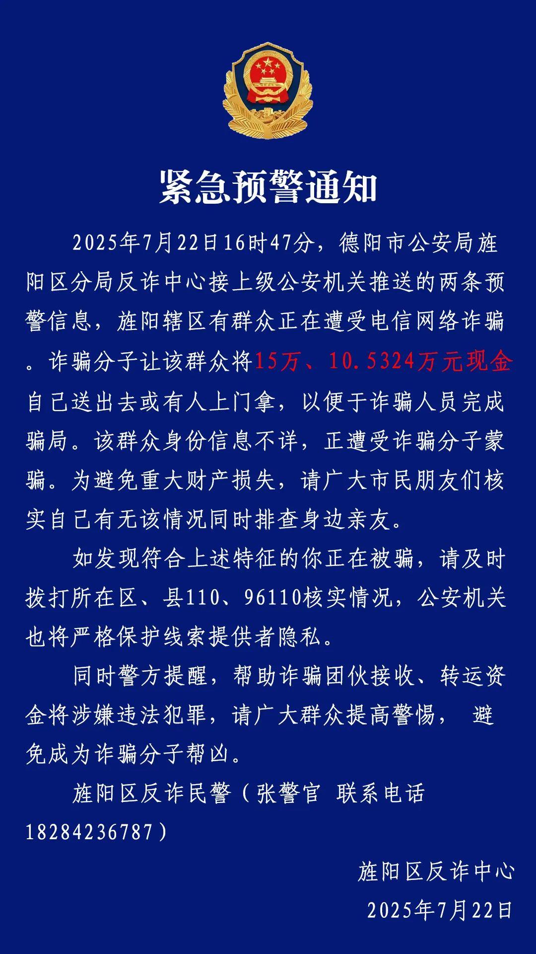 7月22日-23日,德阳市公安局旌阳区分局反诈中心在24小时内连续发布三条紧急预警通知,揭露一种要求受害者亲自运送大额现金或等待诈骗分子上门取款的新型电信网络诈骗手法,总涉案金额已超过80万元。