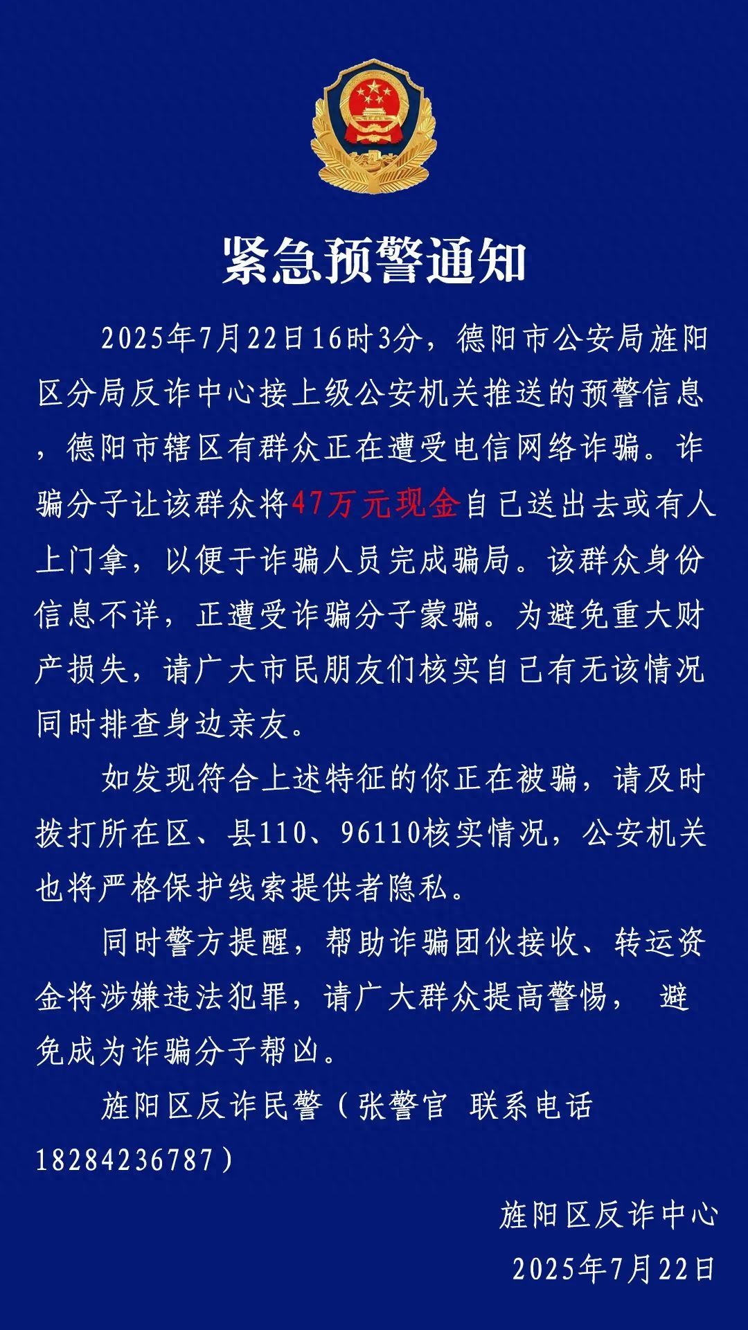 7月22日16时03分,德阳市公安局旌阳区分局反诈中心接上级公安机关推送的预警信息:德阳市辖区有群众正在遭受电信网络诈骗。诈骗分子让该群众将47万元现金自己送出去或有人上门拿,以便于诈骗人员完成骗局。该群众身份信息不详,正遭受诈骗分子蒙骗。为避免重大财产损失,请广大市民朋友们核实自己有无该情况同时排查身边亲友。