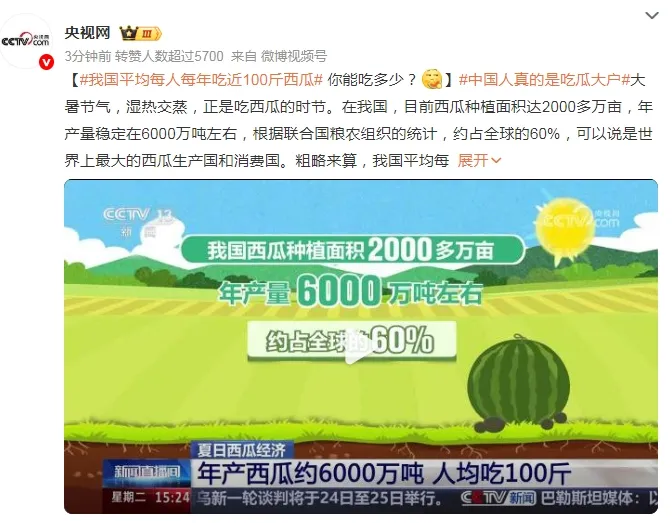 今天,一则#我国平均每人每年吃近100斤西瓜#的新闻冲上热搜,据联合国粮农组织数据显示,我国西瓜年产量6000万吨,占全球60%,平均每人每年要干掉将近100斤西瓜!这相当于每天半个西瓜的节奏!难怪网友调侃:“如果西瓜界也有KPI,那必须是中国人撑起了半边天!”