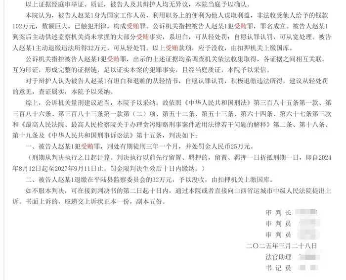 在判决书中,法院认为,赵兴辉身为国家工作人员,利用职务上的便利为他人谋取利益,非法收受他人给予的钱款102万元,数额巨大,已触犯刑律,构成受贿罪。2025年3月28日,平陆县法院一审判决赵兴辉犯受贿罪,判处有期徒刑三年一个月,并处罚金25万元。7月23日,记者从平陆县官方人士处证实上述判决。
