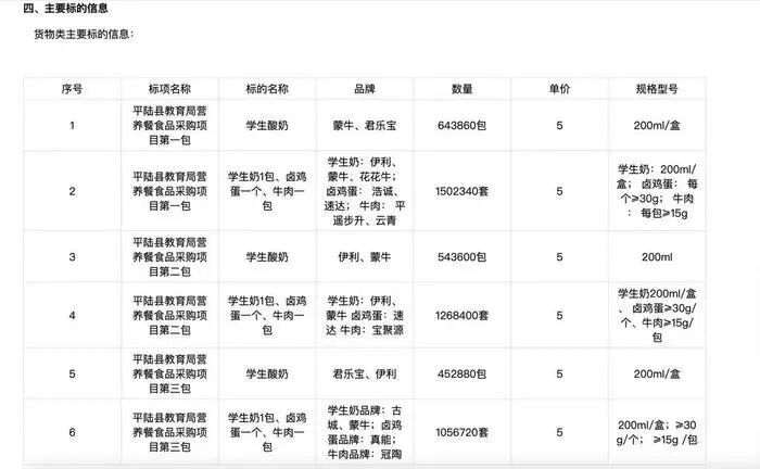 据媒体报道,2024年5月14日,山西省政府采购网曾披露《平陆县教育局营养餐食品采购项目结果公告》,而据该公告披露,三家中标公司所提供的200ml/盒的蒙牛、君乐宝等品牌酸奶价格皆为5元,远高于市场价格。