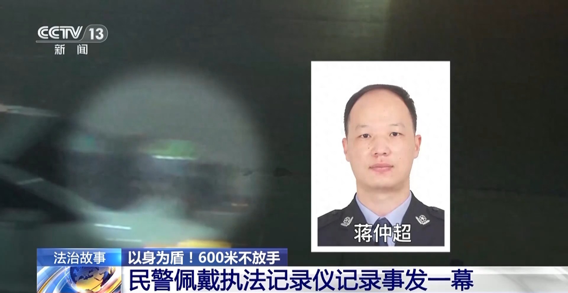 这辆疾驰的汽车一直把一个人顶在引擎盖上,这个人正是警察蒋仲超,从他当天佩戴的执法记录仪拍摄下的画面可以到,蒋仲超一直在努力抓紧汽车的引擎盖,确保自己不会掉下车,然而在一声剧烈的撞击声后,他佩戴的执法记录仪摔到了地上。
