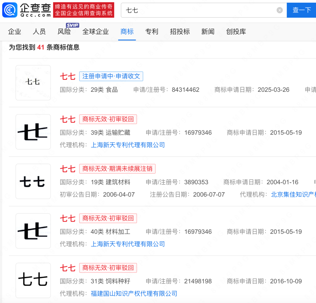 七七妈妈隐藏多条视频,“七七”曾被申请注册商标多为无效