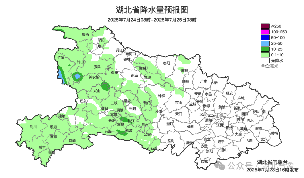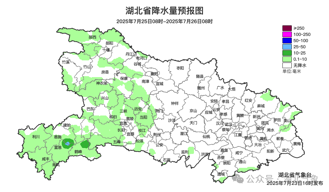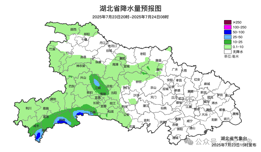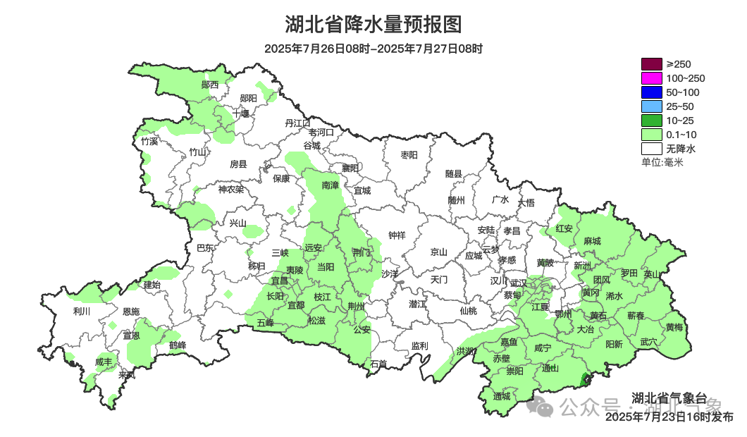 7月23日20时-24日08时,鄂西南阴天有分散性中到大雨,局地暴雨;鄂西北、江汉平原、鄂东北西部阴天有阵雨或雷阵雨;其他地区多云。最低气温23~28℃,偏东风2到3级。