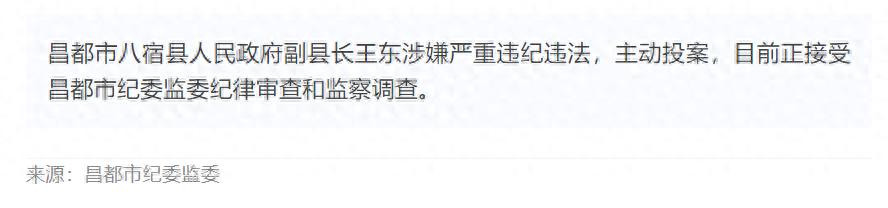 昌都市八宿县人民政府副县长王东涉嫌严重违纪违法,主动投案,目前正接受昌都市纪委监委纪律审查和监察调查。