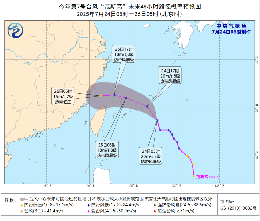 大风预报:7月24日08时至25日08时,受“范斯高”和“竹节草”的共同影响,东海大部、台湾海峡、台湾以东洋面、巴士海峡、南海东部和南部、杭州湾、浙江沿海、福建沿海、台湾岛沿海将有6~8级、阵风9~10级大风,其中,南海东部的部分海域风力可达9~10级、阵风11~12级。